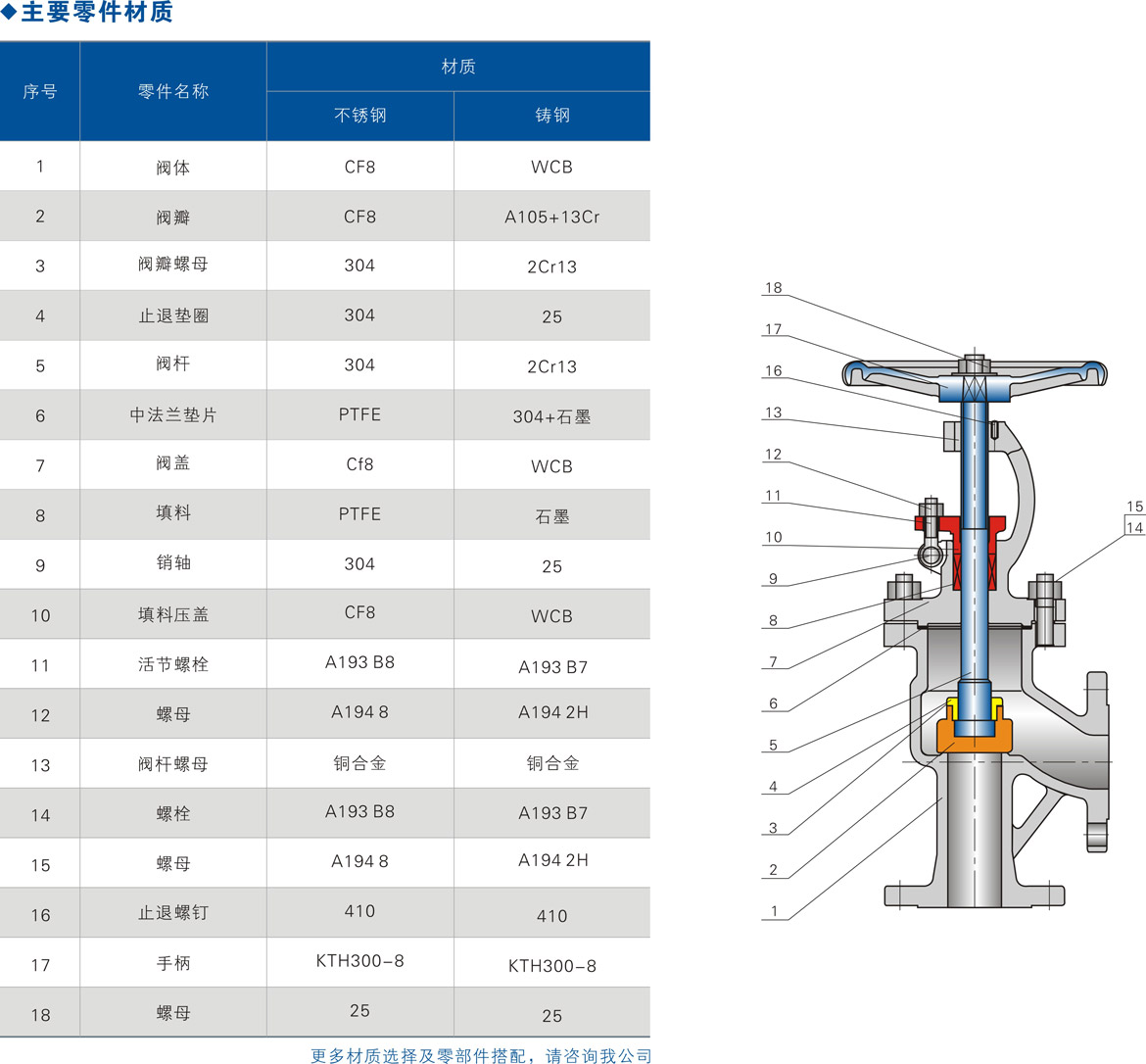 ⑨閥桿螺母:通常情況下,閥桿螺母材料采用銅合金。可以根據用戶要求采用高鎳鑄鐵等材料,對于大口徑的截止閥:閥桿螺母和閥桿之間設計有滾動軸承,可以有效減小截止閥的開啟力矩使閥門可以輕松開關。