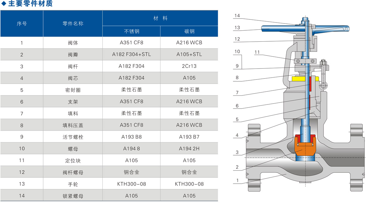 ⑨閥桿螺母:通常情況下,閥桿螺母材料采用銅合金。可以根據用戶要求采用高鎳鑄鐵等材料,對于高壓大口徑的截止閥:閥桿螺母和閥桿之間設計有滾動軸承,可以有效減小截止閥的開啟力矩使閥門可以輕松開關。