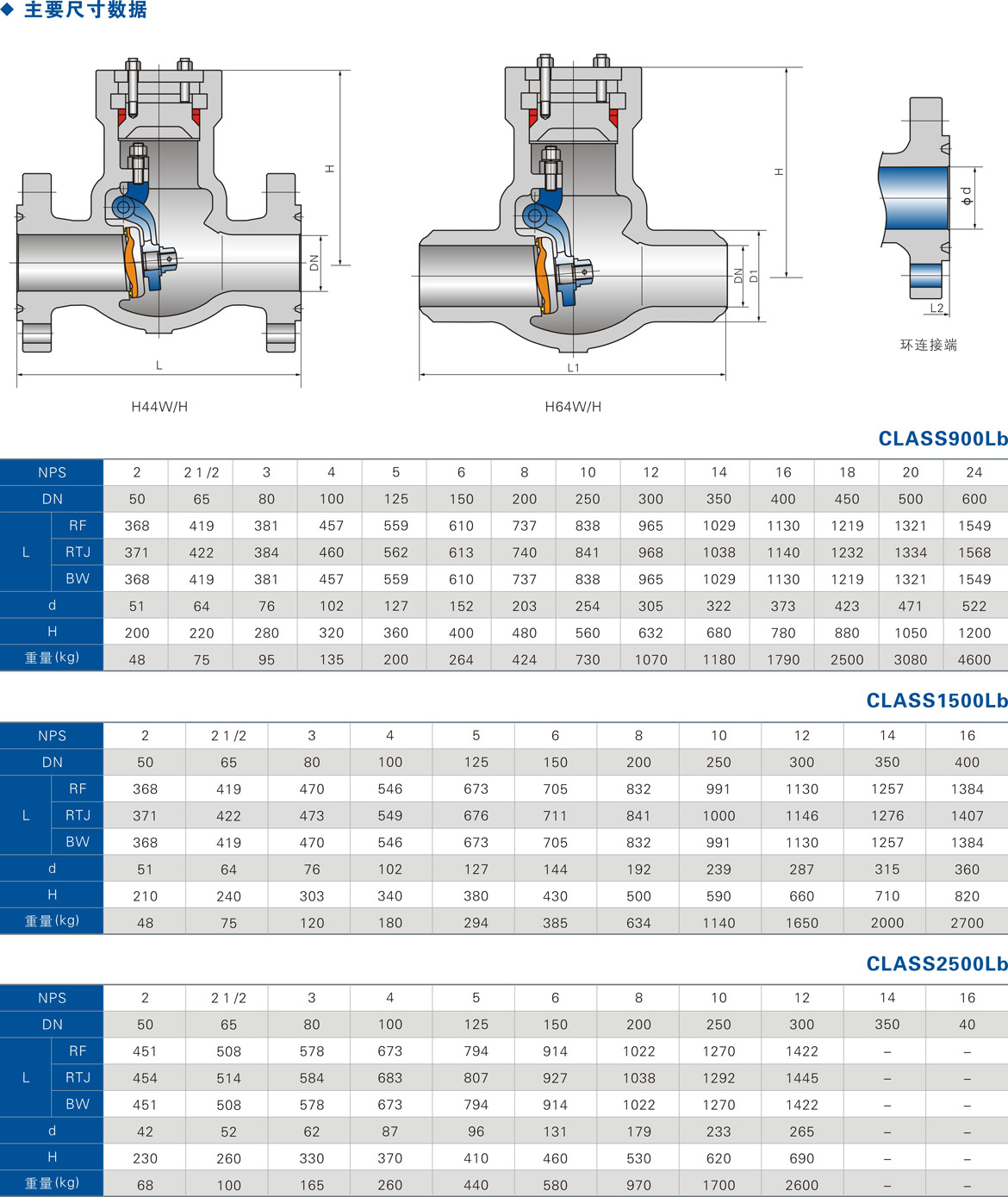 設(shè)計制造標(biāo)準(zhǔn)符合BS1868、ASME B1634、API6D。用于高中壓工況,壓力越大密封效果越好,產(chǎn)品剛性好、密封性能優(yōu)秀,是高中壓管線閥門中最常見的止回閥之一。
